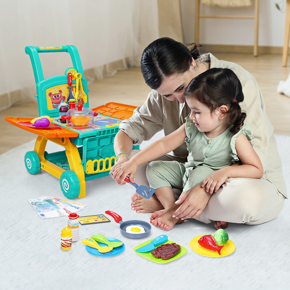 Es 2 juguetes en 1: carrito de mercado y cocinita convertible. Incluye sonidos, accesorios de comida (frutas y verduras) y accesorios para cocinar, para que pueda comprar, transformar el carrito y cocinar en un solo juego, manteniendo siempre su interés.
