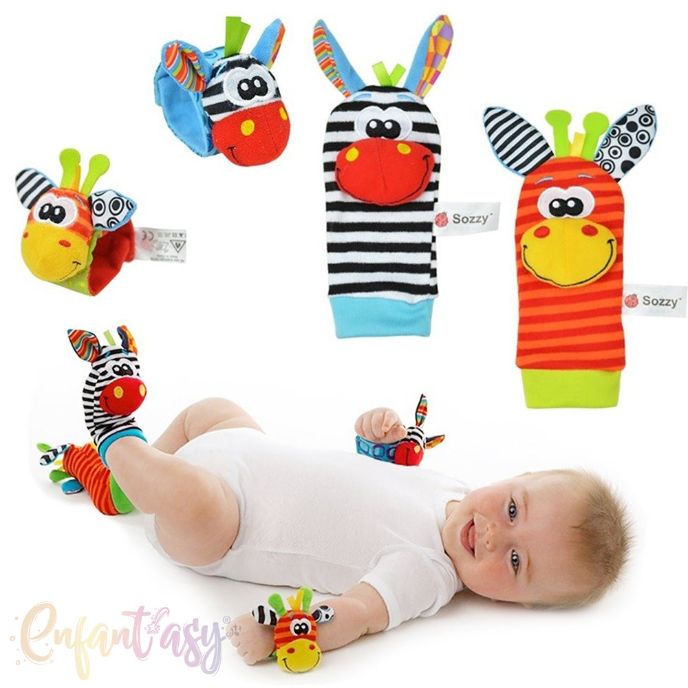 Estas medias cuentan con pequeños juguetes o figuras suaves y coloridas cosidas a su extremo, lo que capta la atención del bebé cada vez que mueve sus piernas. La estimulación visual y táctil que generan es fundamental para potenciar el desarrollo temprano, ya que incentiva el seguimiento visual, el enfoque y la asociación causa-efecto.