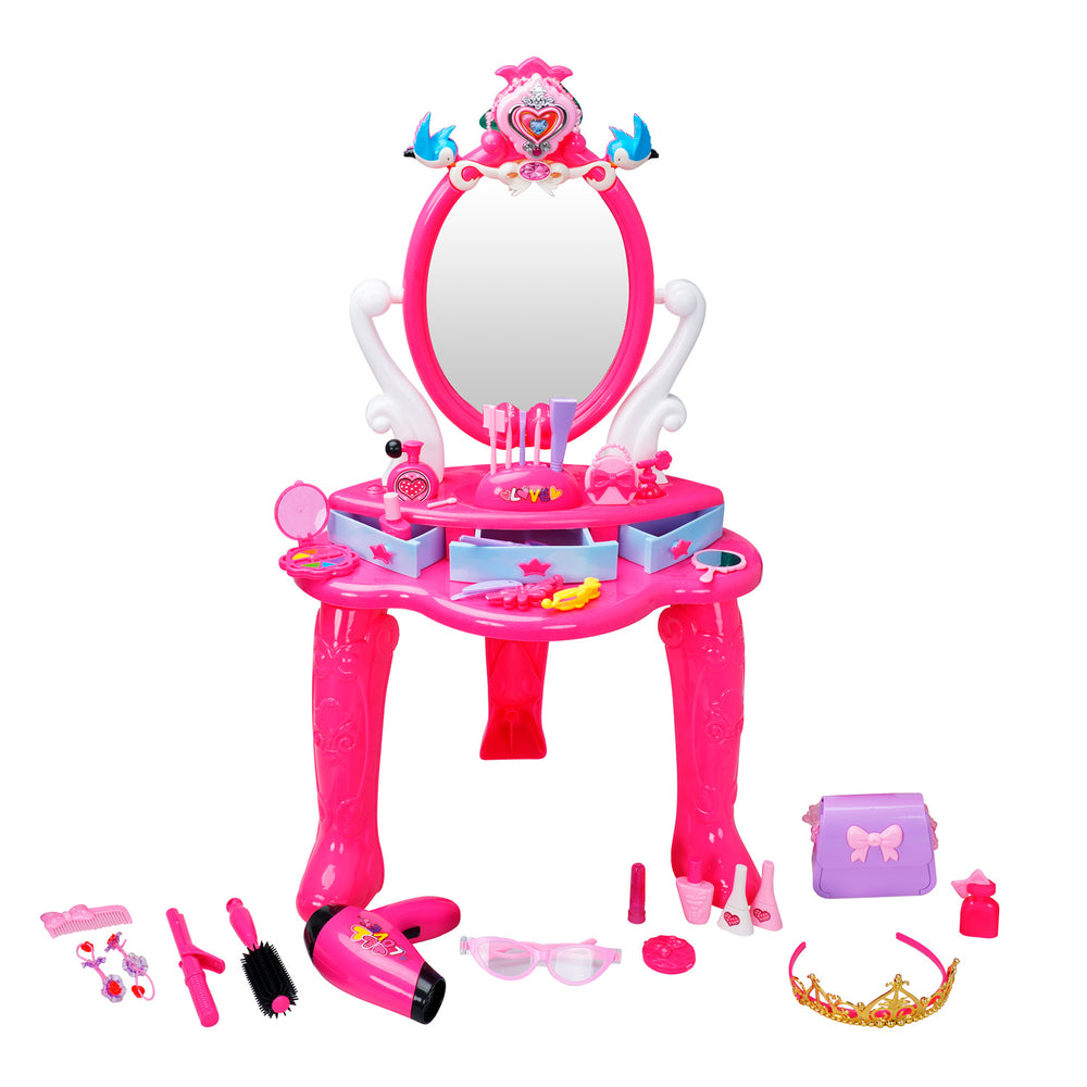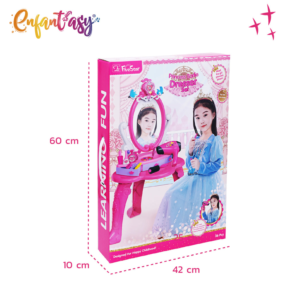 La nueva mesa tocador de Enfantasy llega para convertirse en el rincón favorito de tu pequeña. Con un diseño delicado y lleno de detalles, este set incluye más de 30 accesorios entre peines, maquillaje de juguete, brochas, pulseras, diademas y un espejo seguro, perfecto para jugar sin preocupaciones.