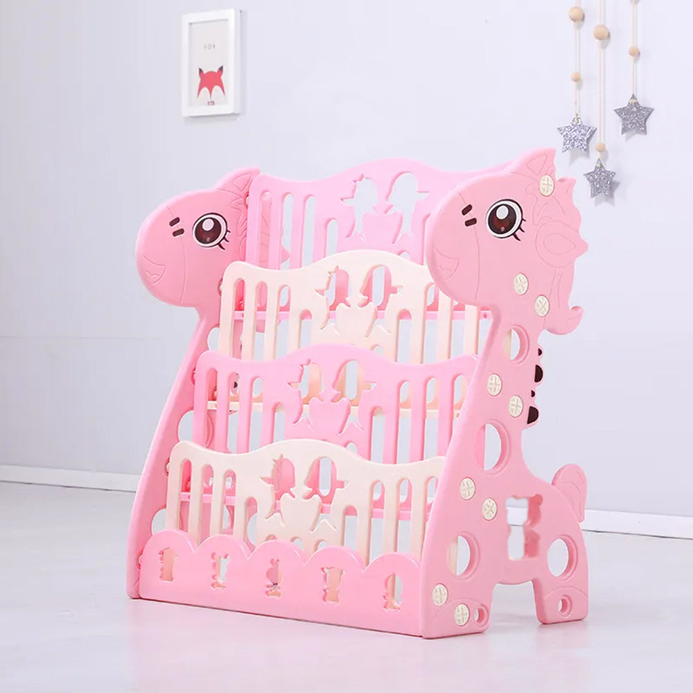 Linda estantería infantil con diseño de Jirafa, fácil de armar. Contiene 4 niveles en los que caben aproximadamente 40 libros. Disponible en rosado y azul.