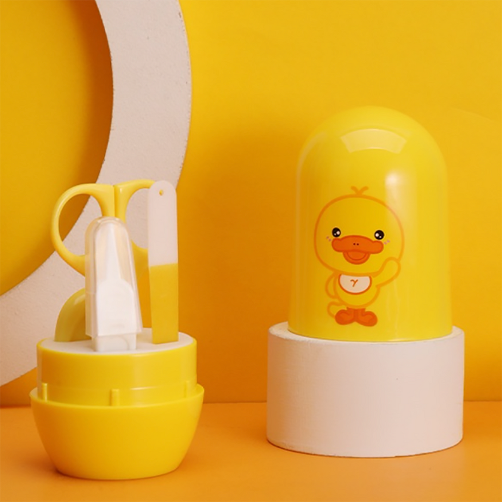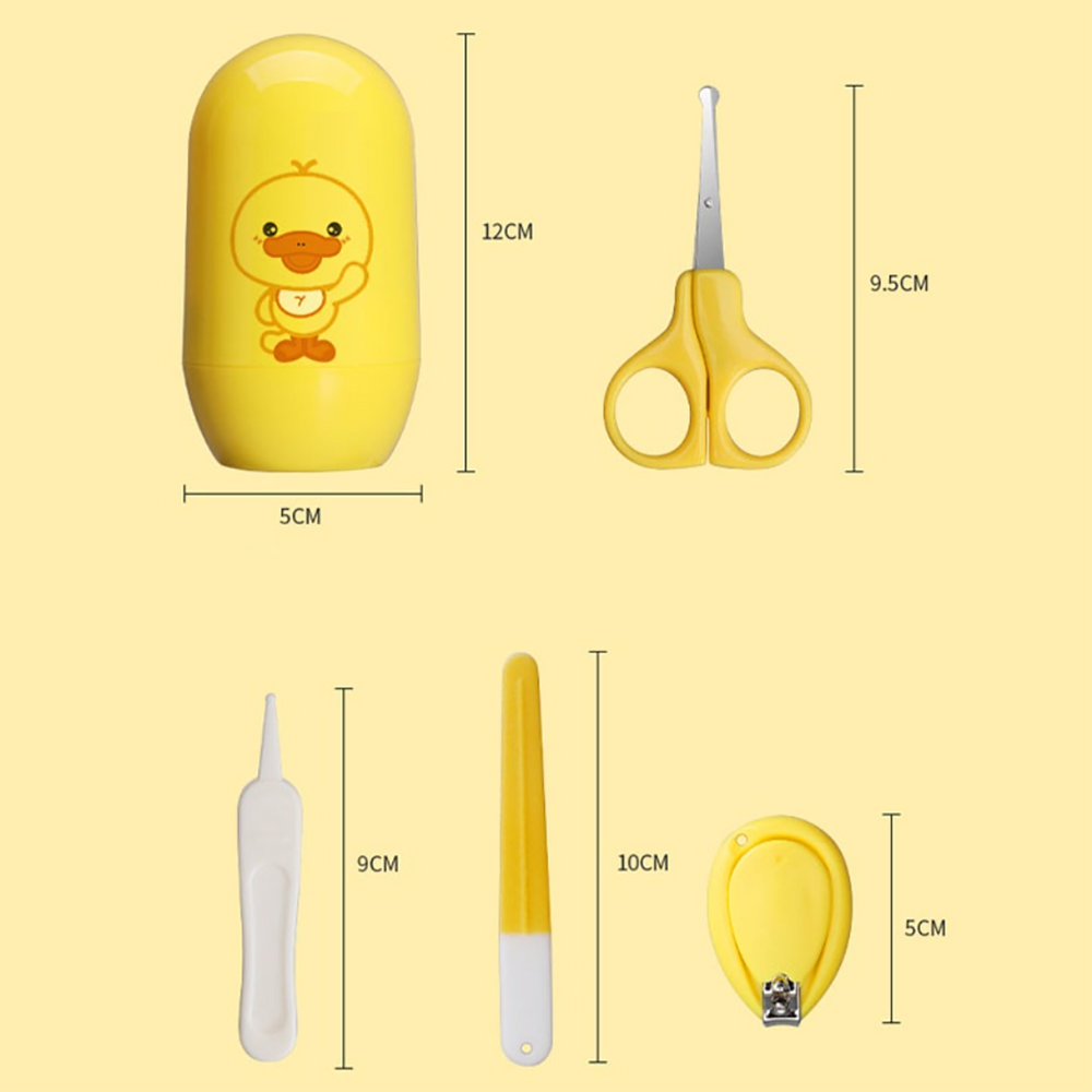 Espectacular set de manicura para bebés y niños. Contiene: cortauñas, lima, tijeras, y pinza sacamocos. Todo esto dentro de un lindo estuche con divertidos diseños.