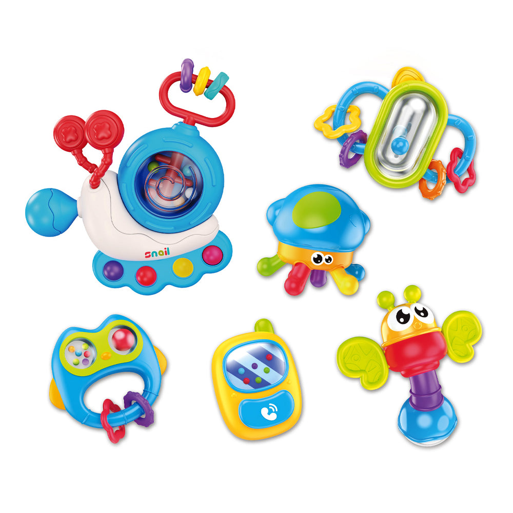 Con el set de mordedores para bebé y sonajeros, Enfantasy ofrece un kit completo ideal para acompañar el proceso de dentición mientras estimula los sentidos y favorece el desarrollo motor. Compuesto por seis piezas diversas en forma, textura y sonido, es perfecto desde los 3 meses hasta pasados los primeros dientes.